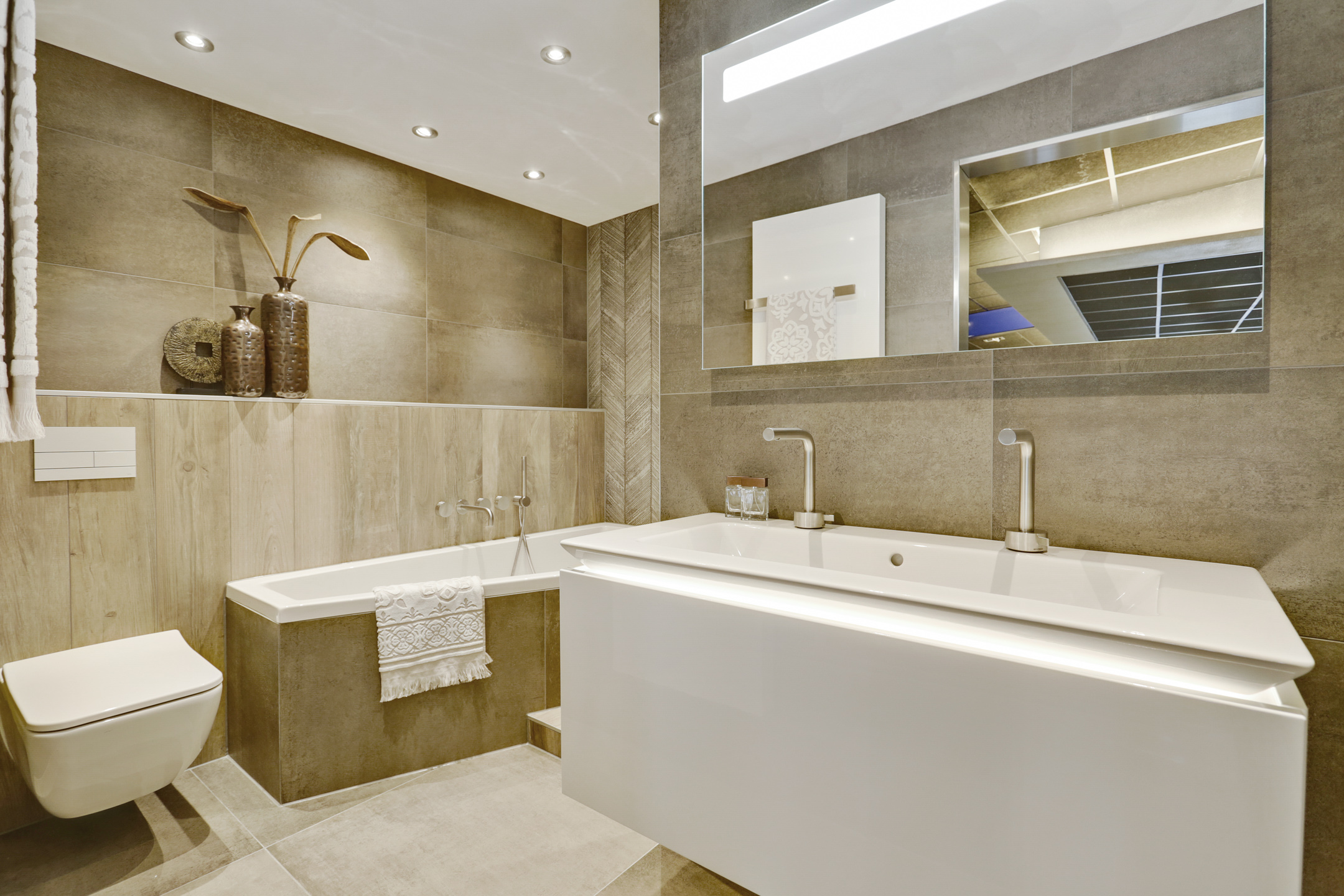 Deze complete badkamer wordt geleverd met top materialen. De grote tegels (80/80 en 40/80) maken het een rustig geheel. Luxe RVS kranen van Fantini en een designmeubel én toilet van Villeroy & Boch. Het ligbad van Xenz en super strakke designradiator.