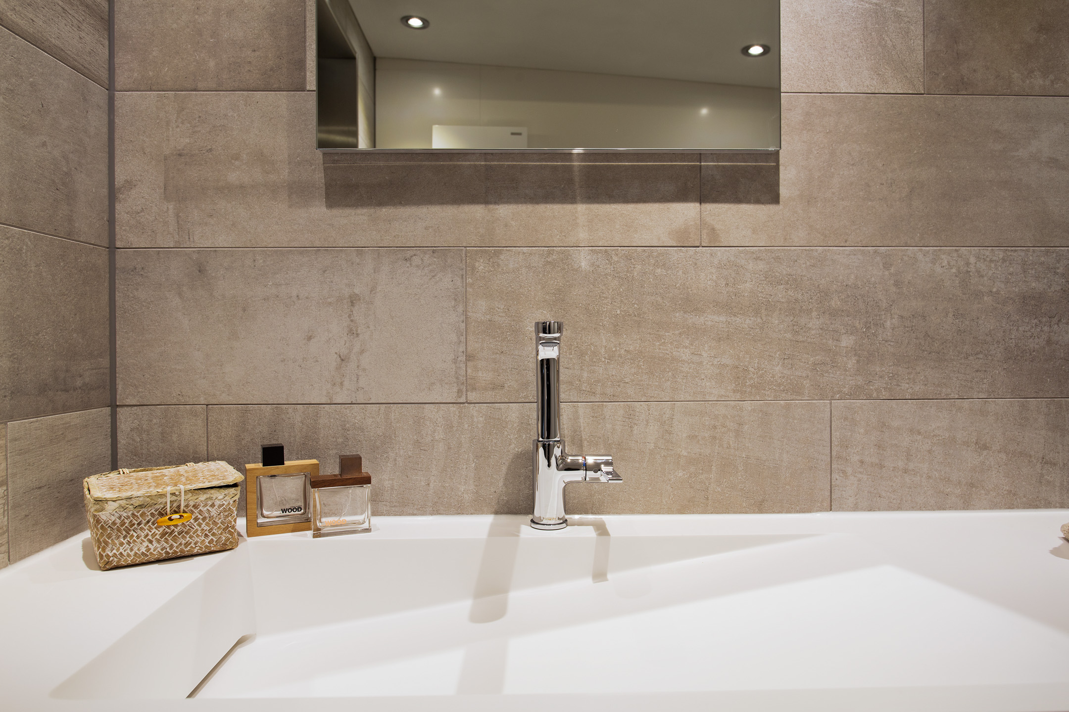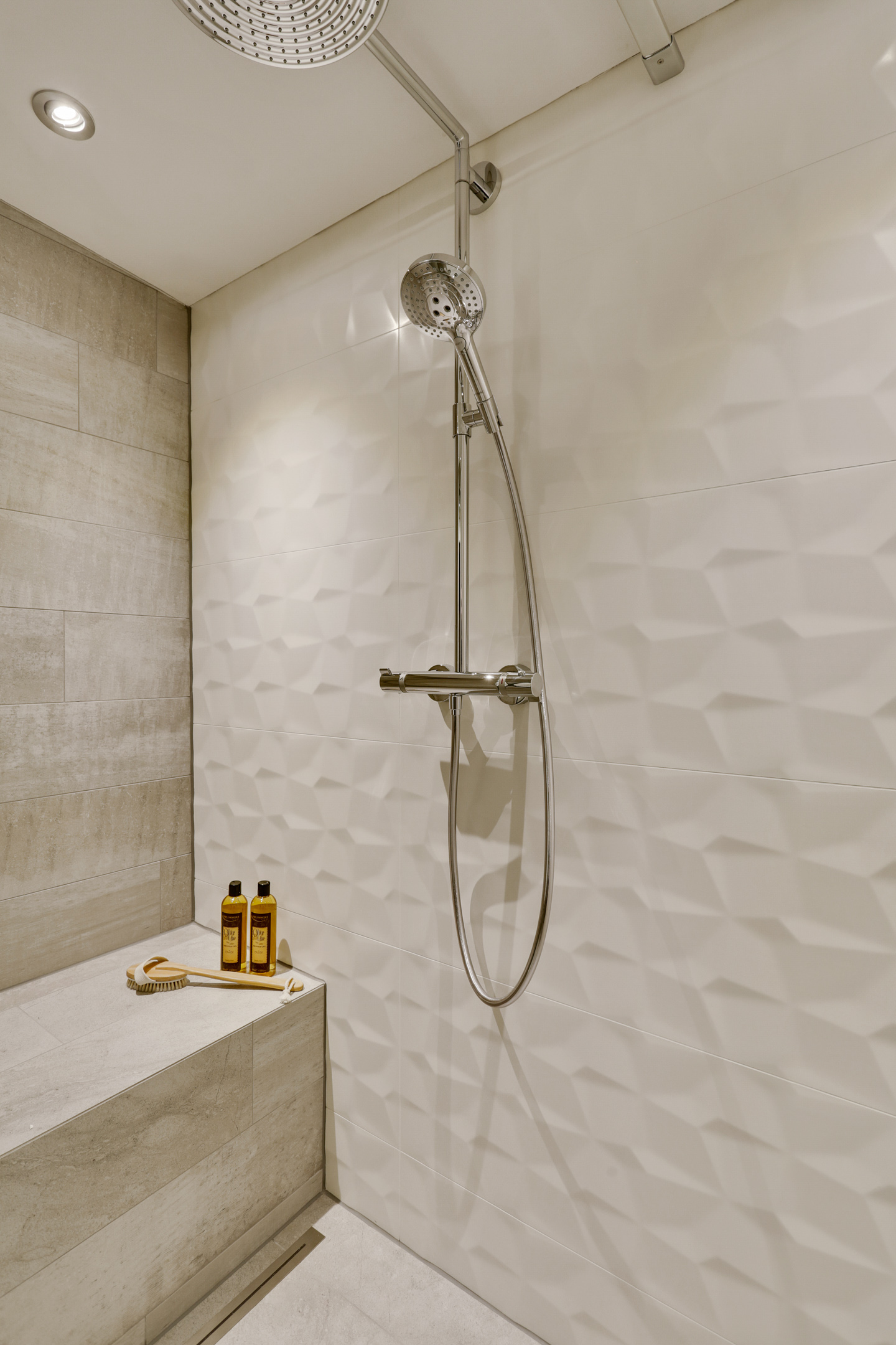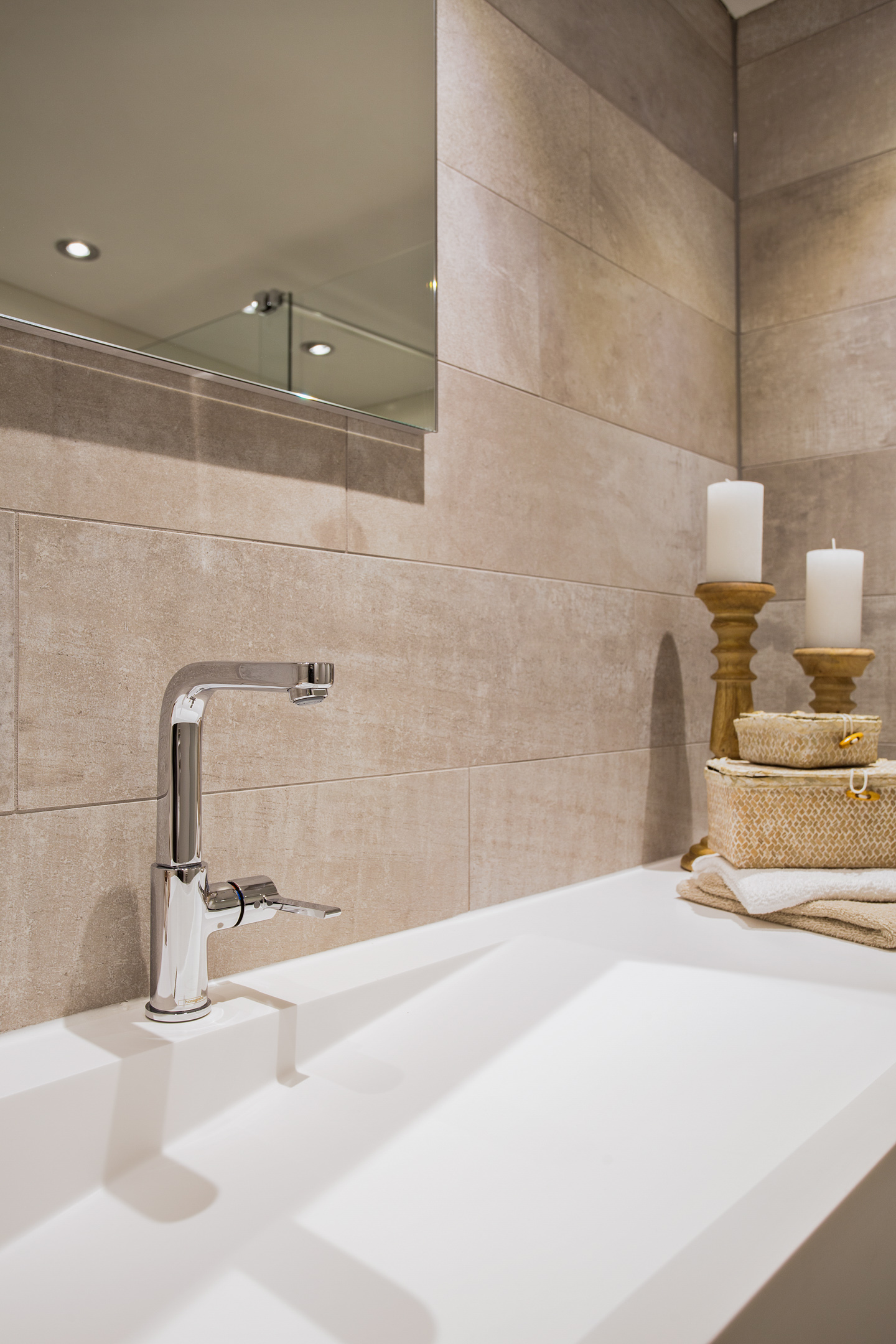 Deze complete badkamer is voorzien van kwaliteitsproducten en wordt aangeboden als totaalconcept. Kenmerkend voor deze moderne strakke badkamer zijn de grootformaat tegels met 3d-structuur, de schuifdeur en de maatwerk solid surface wastafel.