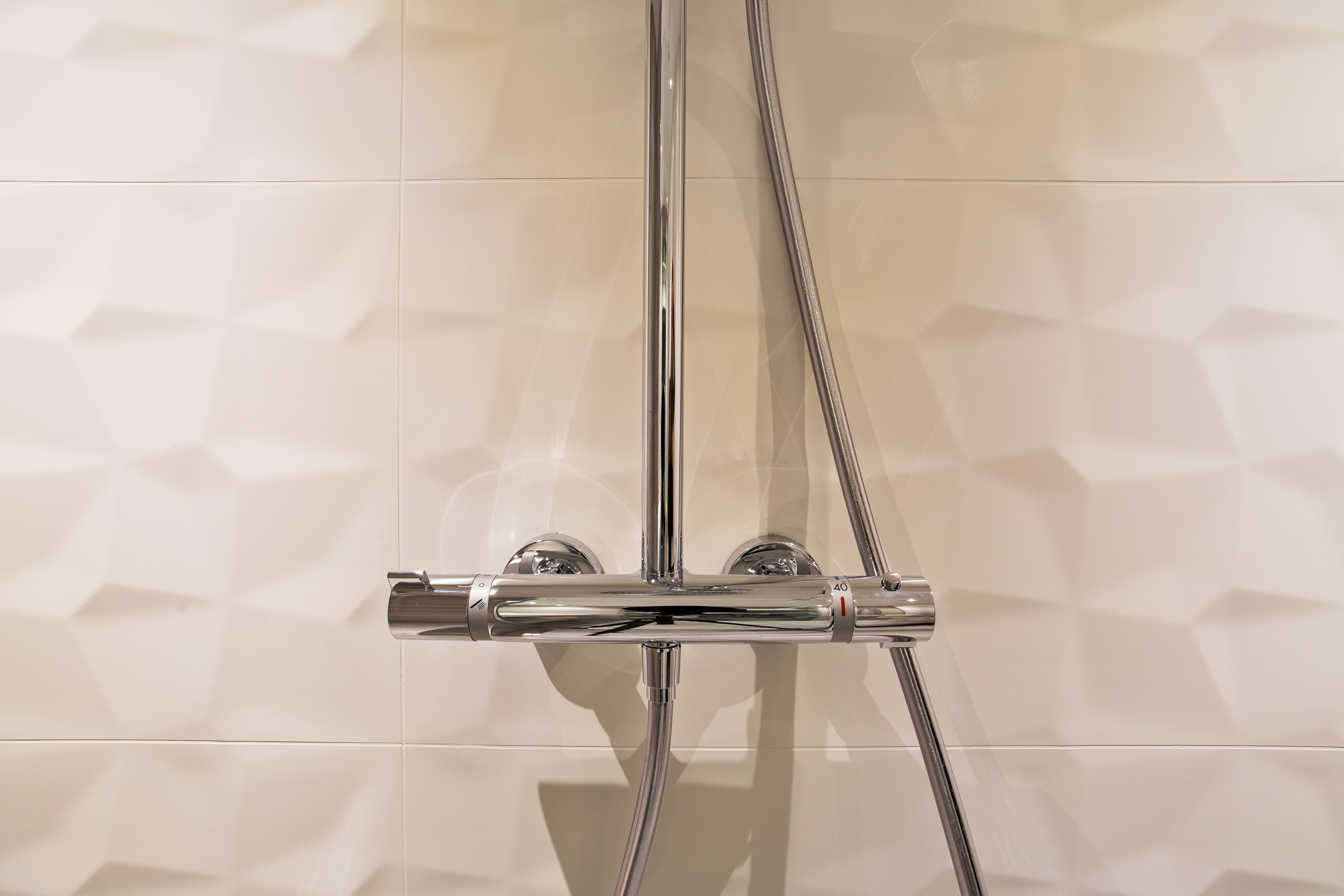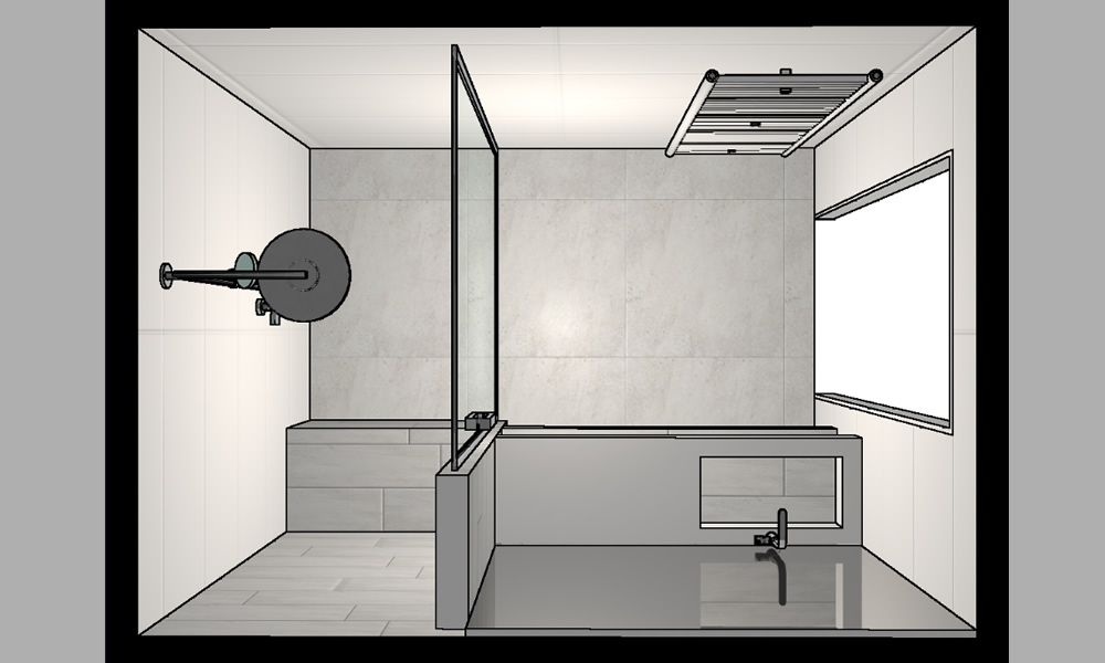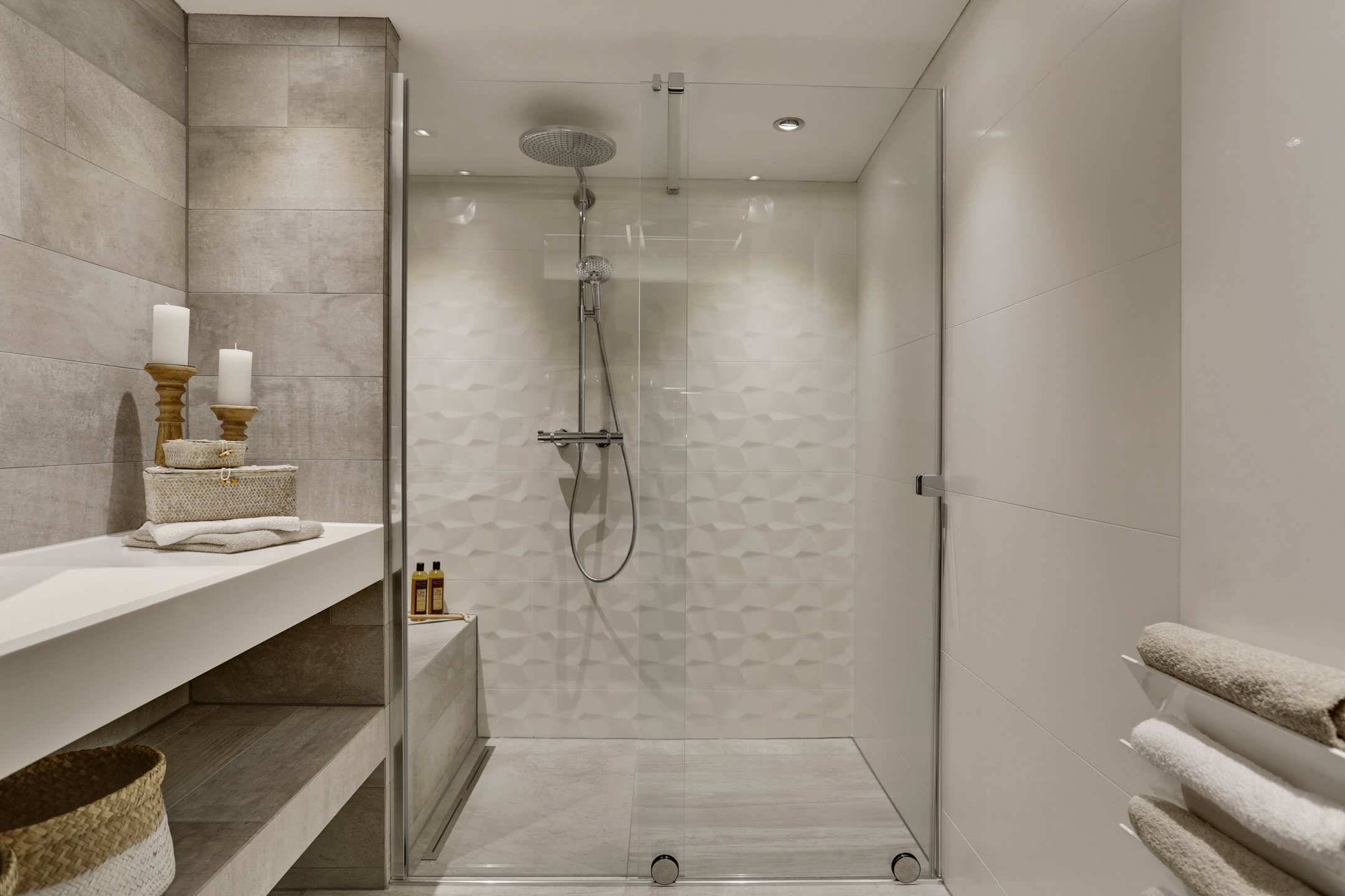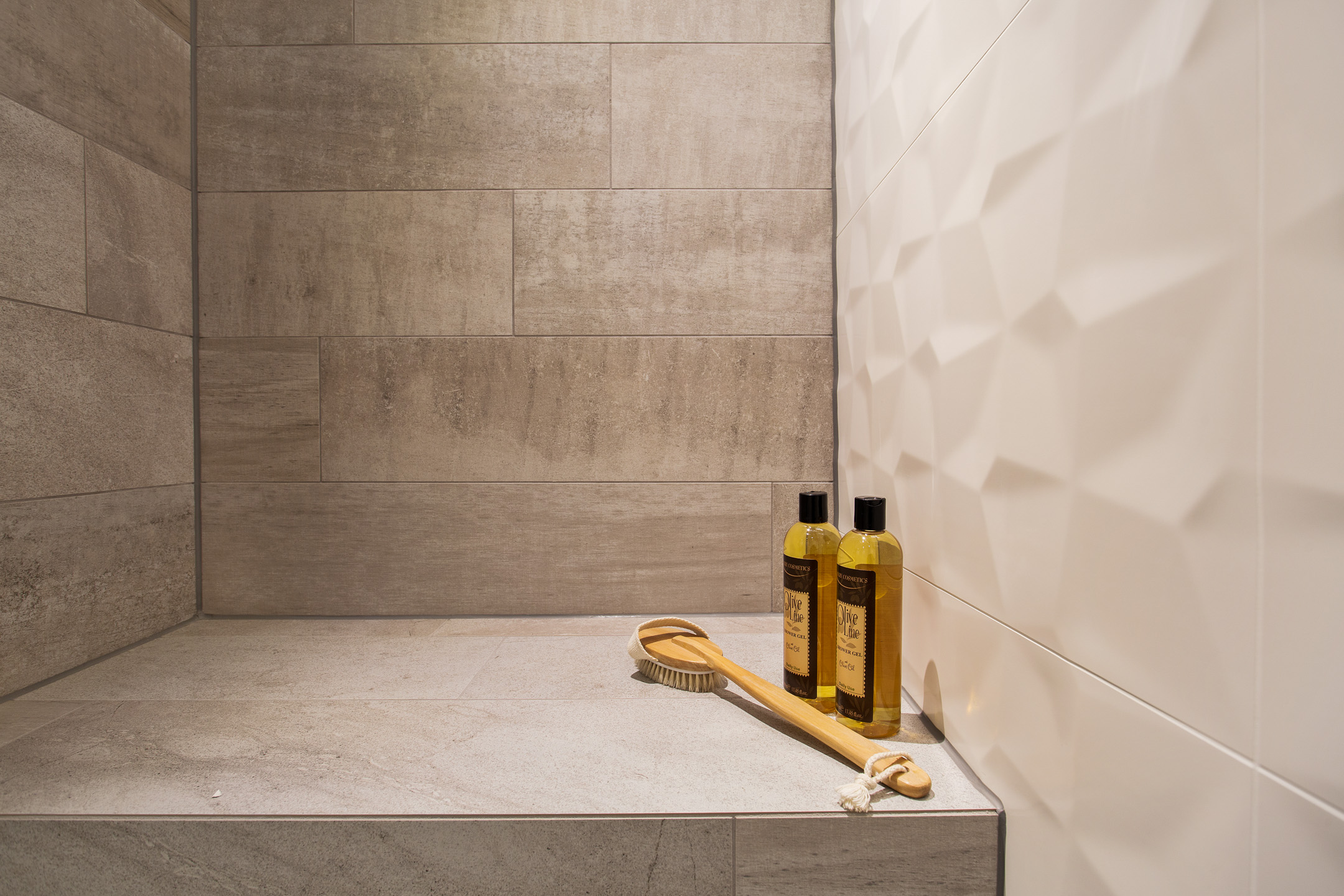 Deze complete badkamer is voorzien van kwaliteitsproducten en wordt aangeboden als totaalconcept. Kenmerkend voor deze moderne strakke badkamer zijn de grootformaat tegels met 3d-structuur, de schuifdeur en de maatwerk solid surface wastafel.